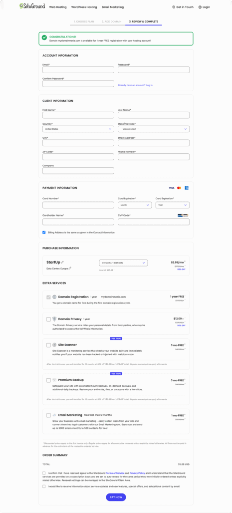 Now it’s time to complete your order. You’ll review your hosting plan and domain, enter your account and payment details, and choose any extra services you want (like domain privacy or SiteScanner). Many of these add-ons are discounted at checkout, so it’s a good time to grab them.