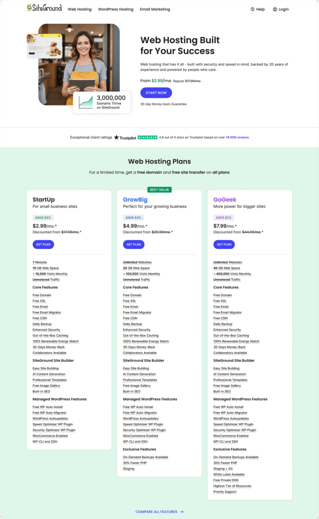 SiteGround offers three shared hosting plans, each built to meet different needs: