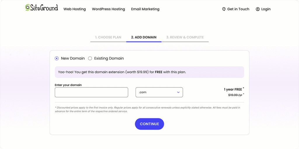 Next, you’ll be prompted to register a domain name or connect an existing one. If you need a new domain, SiteGround makes it easy and often includes a free domain for the first year during promotions.